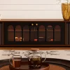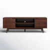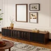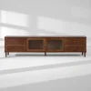 A sleek modern TV stand featuring sliding doors and multiple compartments for organized storage and a refined living space.
