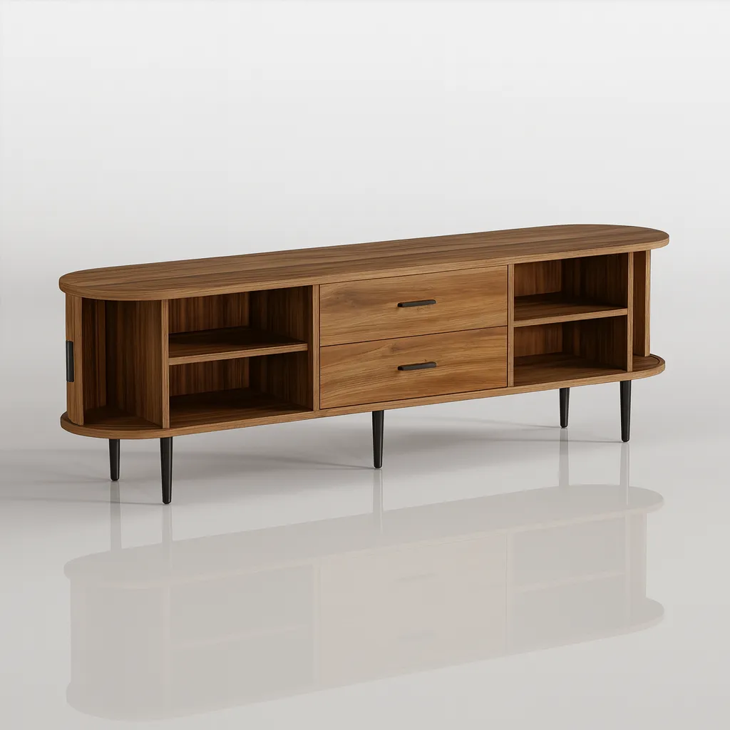 A mid-century inspired console cabinet with open shelving and drawers, offering stylish storage for the living room.