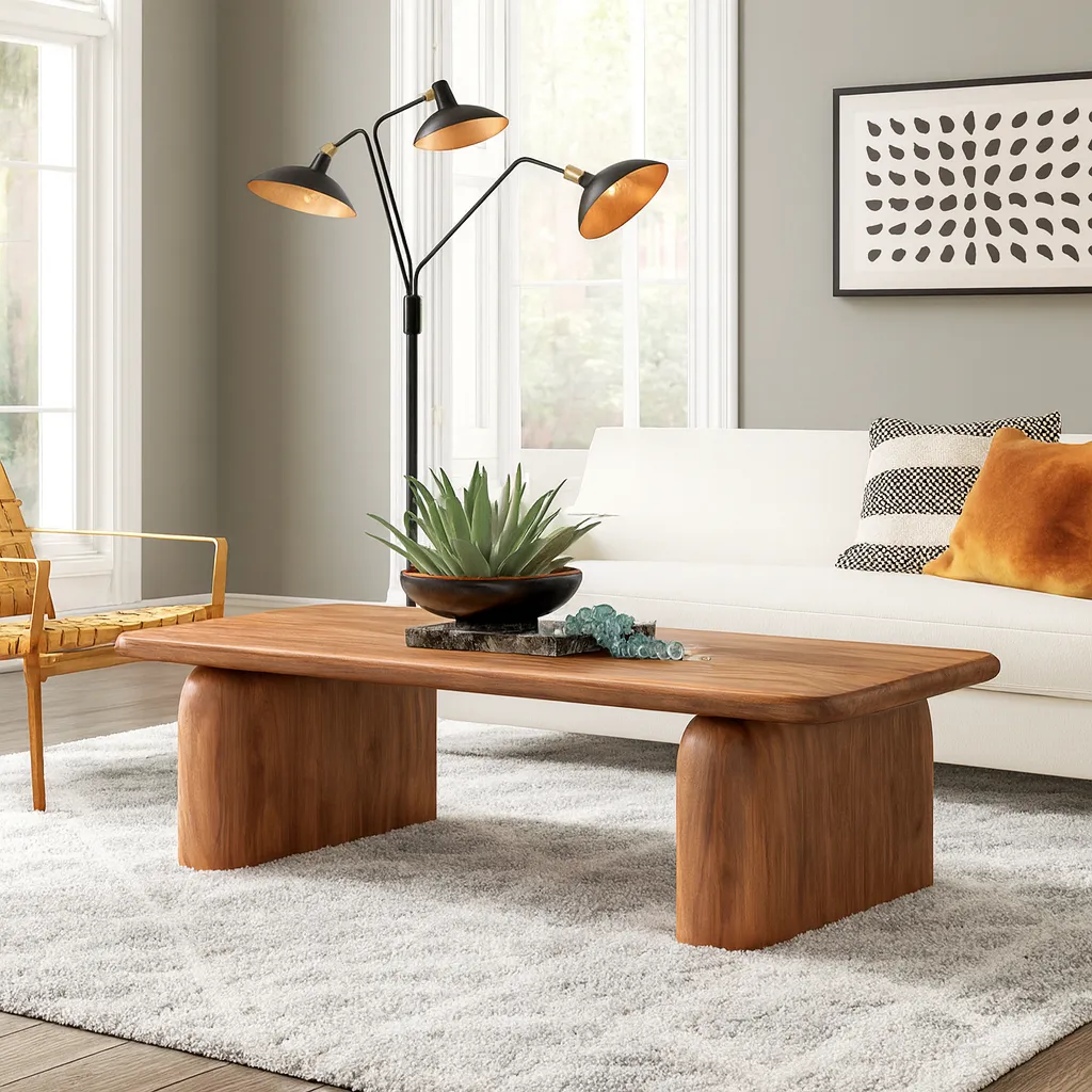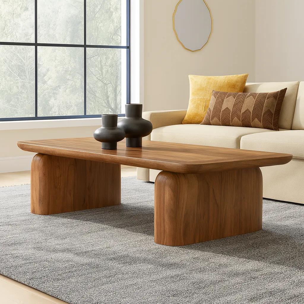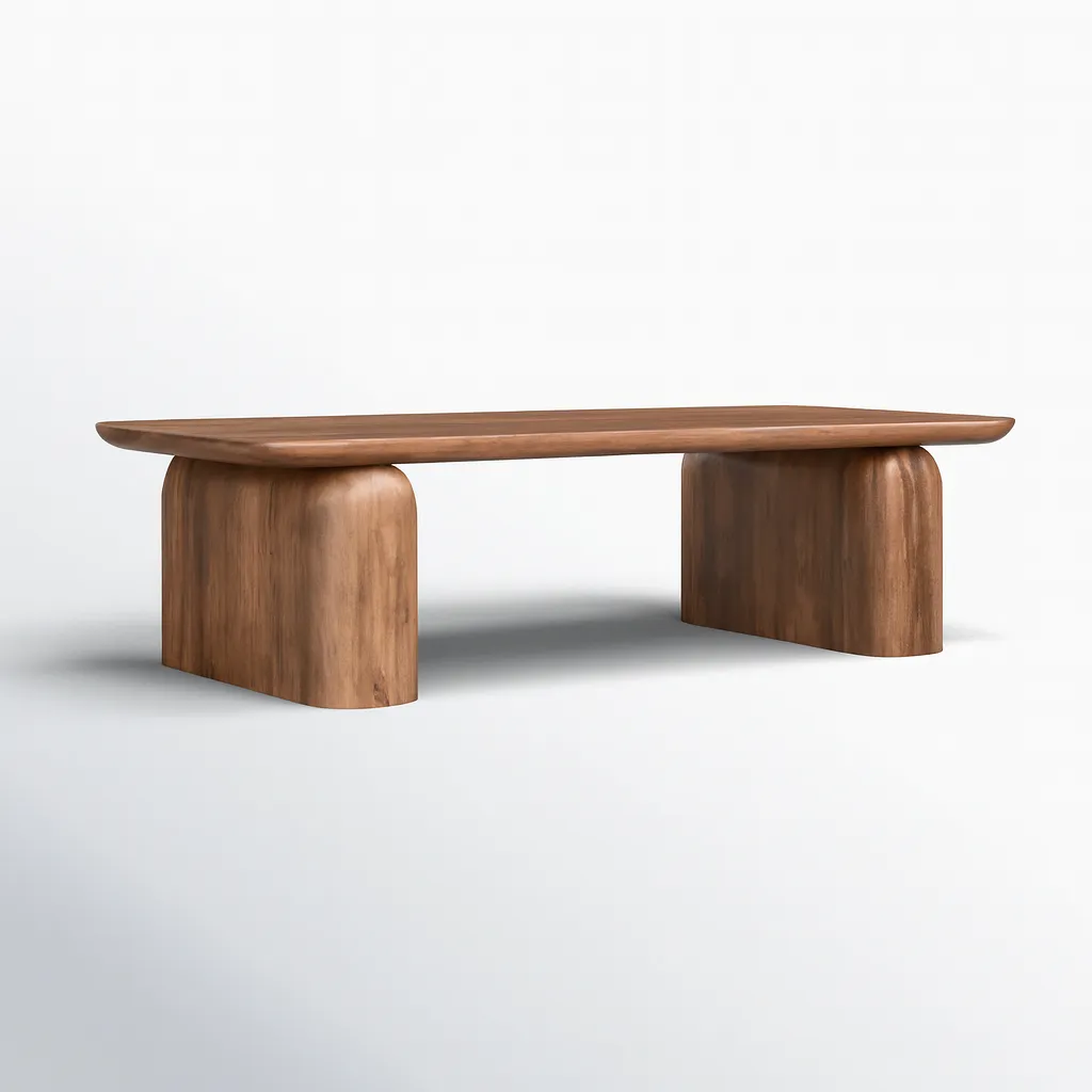 Rectangular wooden coffee table with rounded design and sturdy legs brings a modern and warm style to the living room.