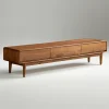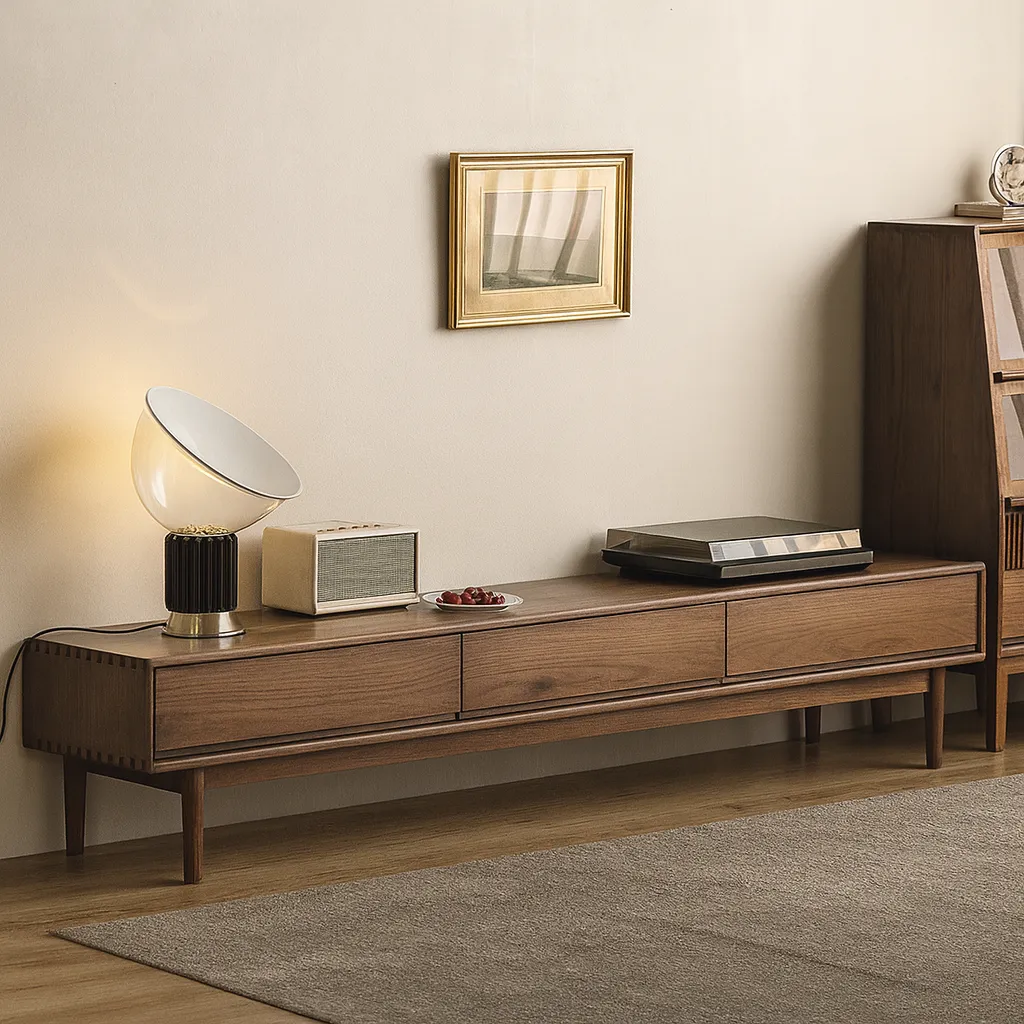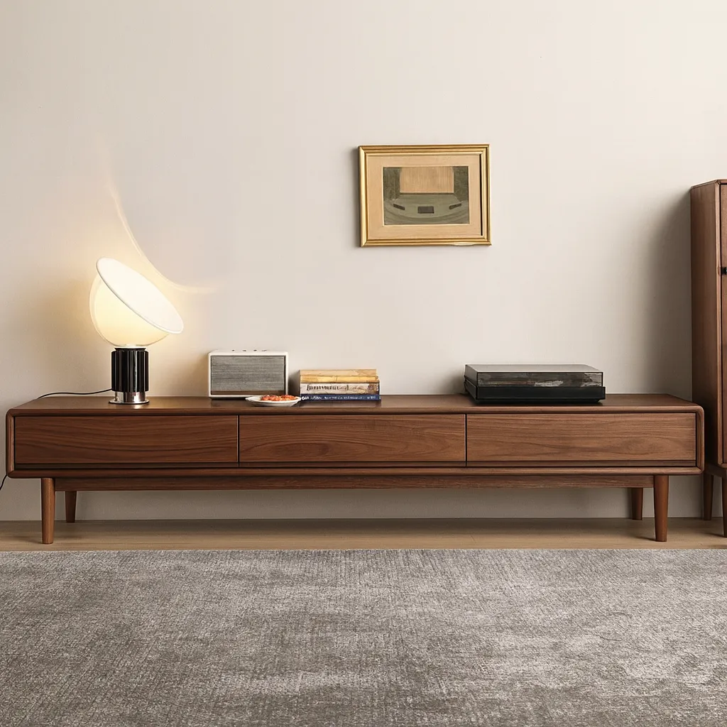 Sleek low-profile TV stand with clean lines and practical drawers for a refined modern living space.