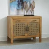 A rustic accent cabinet with a handwoven door design and warm wood frame for a natural, textural look.