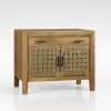 A rustic accent cabinet with a handwoven door design and warm wood frame for a natural, textural look.